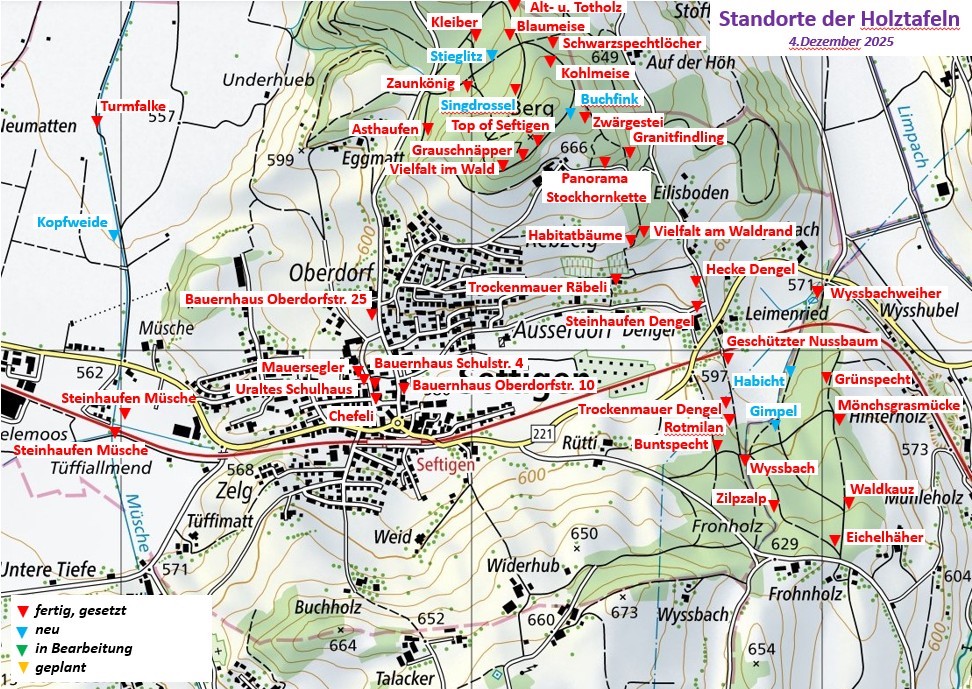 Die von Herbert Walker gestalteten Thementafeln in Seftigen stellen interessante Objekte aus den Themen Natur, Kultur, Geschichte und Landwirtschaft vor. Am 26. Mai 2024 fand ein Streifzug durch Seftigen statt, dabei wurden einige der Tafeln näher vorgestellt. Der NVS hat die Tafeln zum Thema Natur mit QR Codes versehen, die den Zugriff auf die untenstehenden, weiterführenden Informationen ermöglicht.